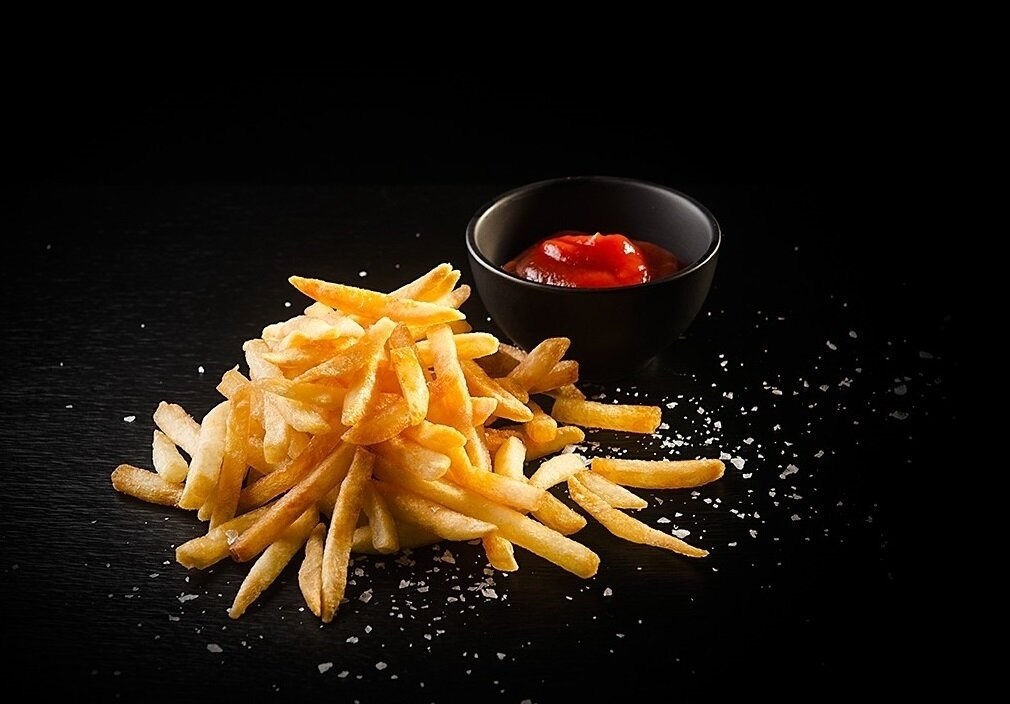 куриное филе, помидоры, огурцы, картофель фри, чесночный соус