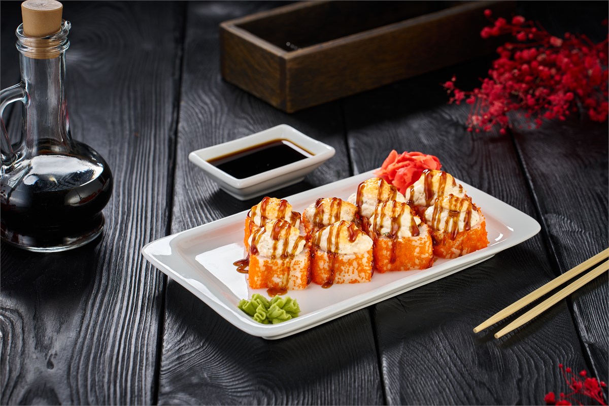 нори, рис, сыр сливочный, угорь, краб, икорный соус. масаго, тереяки, лук